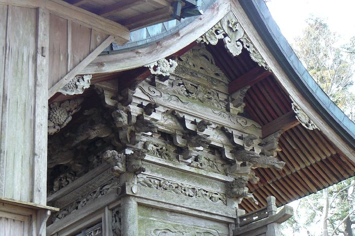 烏峠稲荷神社本殿は江戸時代中期に造営された一間社流造、銅板葺き、外壁は真壁造り板張りの古建築物で、木鼻、懸魚、蟇股、突板、扉など建物全体が龍や獅子、鳳凰、中国故事などの彫刻が施され、貴重な事から昭和51年(1976)に泉崎村指定有形文化財(建造物)に指定されています。拝殿は木造平屋建て、入母屋、銅板葺き、平入、桁行3間、正面1間向拝付き、外壁は真壁造板張り。祭神:倉稲魂命。
